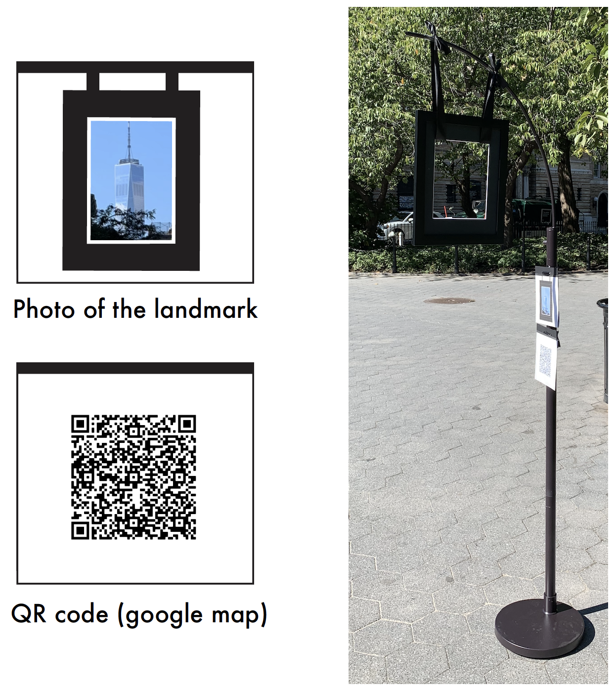 QR code-opens google map/info of the landscape that is seen through the frame (really useful for people who are not familier with New York landscapes).
