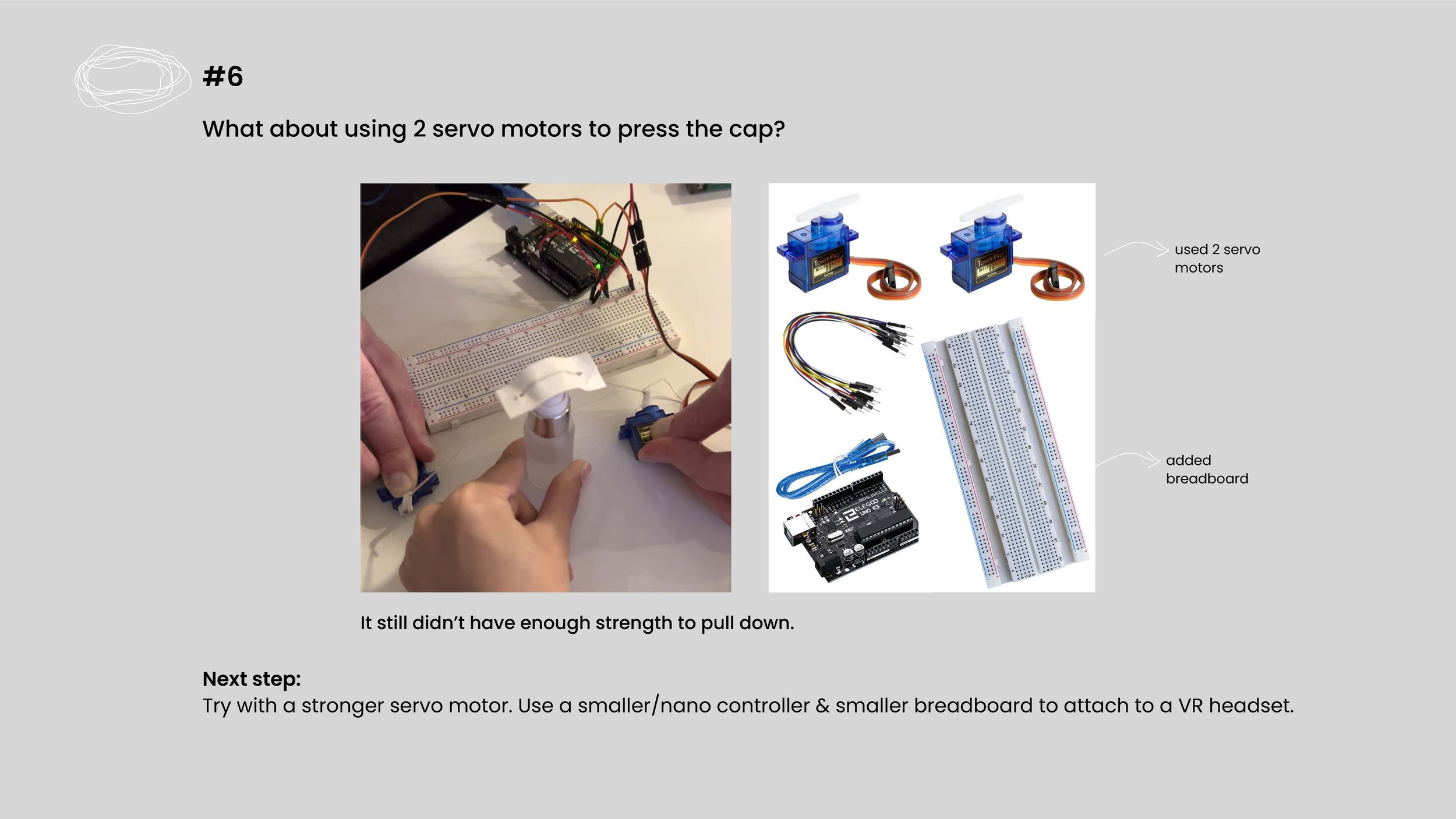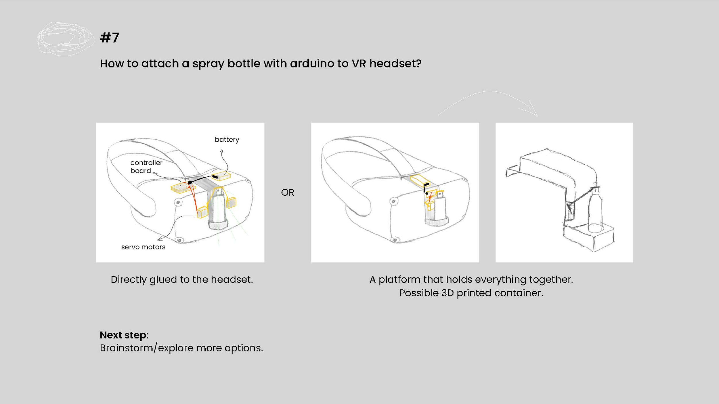 Day 7 of prototyping explored options for a container that holds everything together which can be attached to the VR headset. It was challenging to come up with one final solution for the container because I didn’t have the final working automatic spray with Arduino at this stage. The size of an Arduino board (nano or regular size), breadboard, and servo motors will influence the shape and size of the container.