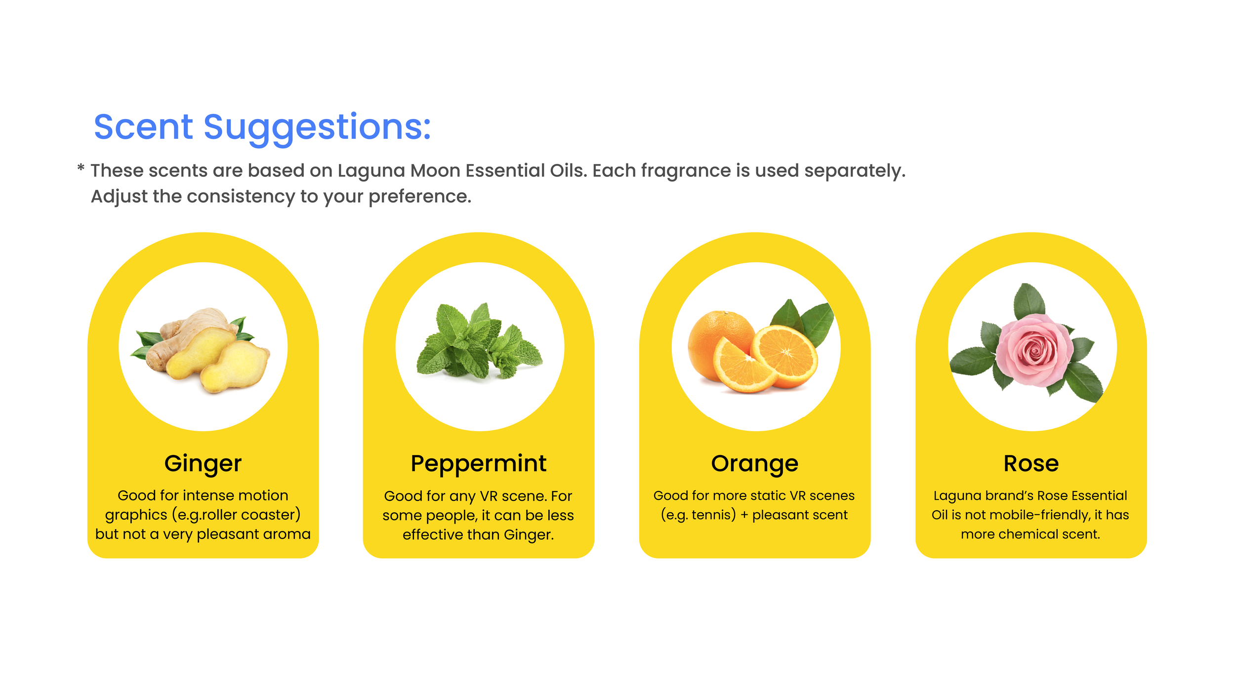 I lightly sprayed oil scents (orange, rose, ginger, peppermint) onto tiny wool balls and stuck them to the headset so it did not have a heavy smell; each scent was tested separately. However, it is essential to note that users were exposed to constant scent and the level of discomfort and time differs depending on what kind of scent (brand) is used.