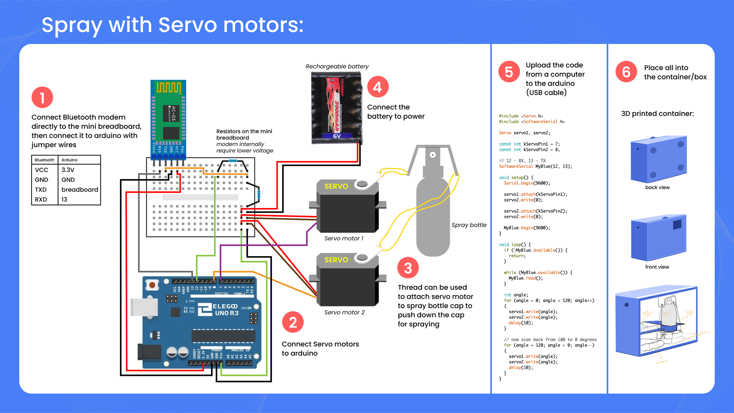 In this step of prototyping, I used two servo motors, thinking that they would have more strength to push down the cap and give more balance if pushed down from two sides of the spray bottle. Using two servo motors was helpful in creating an evenly balanced push; however, the servo motors I used still didn’t have the strength to push down the cap of the spray bottle. So, I researched and learned that servo motors have different types and strengths, and I was using the most basic one.